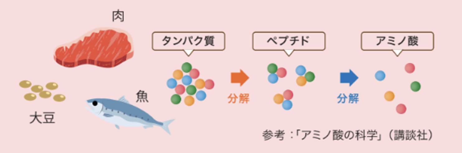 タンパク質は20種類のアミノ酸が50個以上つながったものです。タンパク質がタンパク分解酵素により分解されるとアミノ酸が20〜50個つながったポリペプチド、2〜20個つながったオリゴペプチドになります。さらに分解されるとペプチドはアミノ酸になります。アミノ酸は小腸から吸収され体内で必要な10万種類ものタンパク質の合成に利用されます。